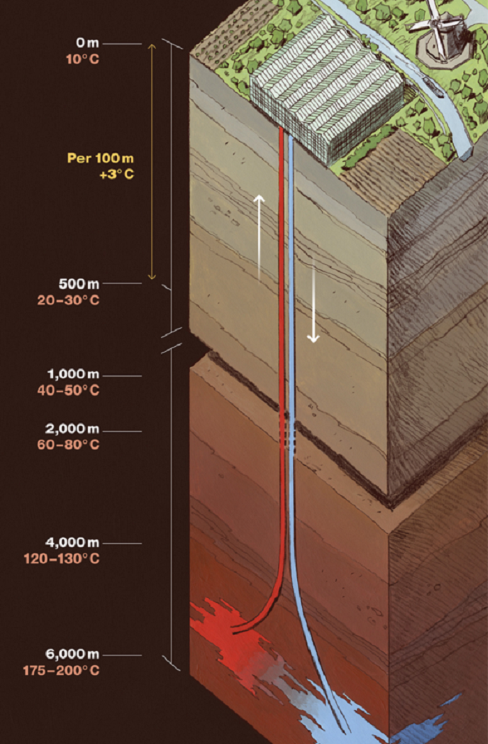Geotermální vytápění funguje tak, že se čerpá horká voda hluboko ze země (obvykle 1000 až 5000 metrů hluboko). Horkou vodu lze použít k vytápění skleníků, což snižuje poptávku po zemním plynu a dalších fosilních palivech.